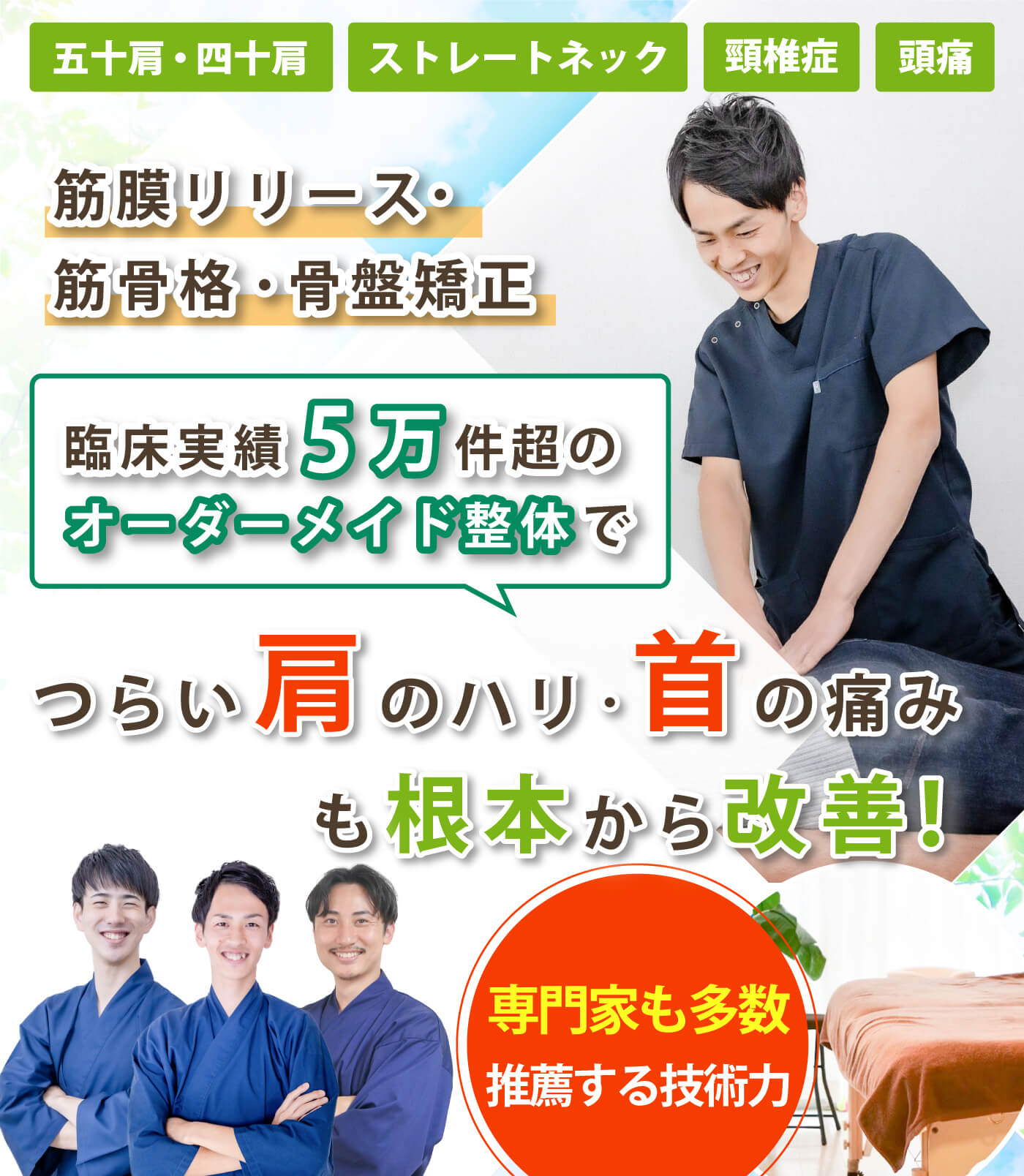 柔道整復師の国家資格をもった院長を筆頭に豊富な経験と知識を持つベテラン施術家のみが担当します。全国からプロの施術家が学びに来る本物の整体技術を、ぜひご体感ください。