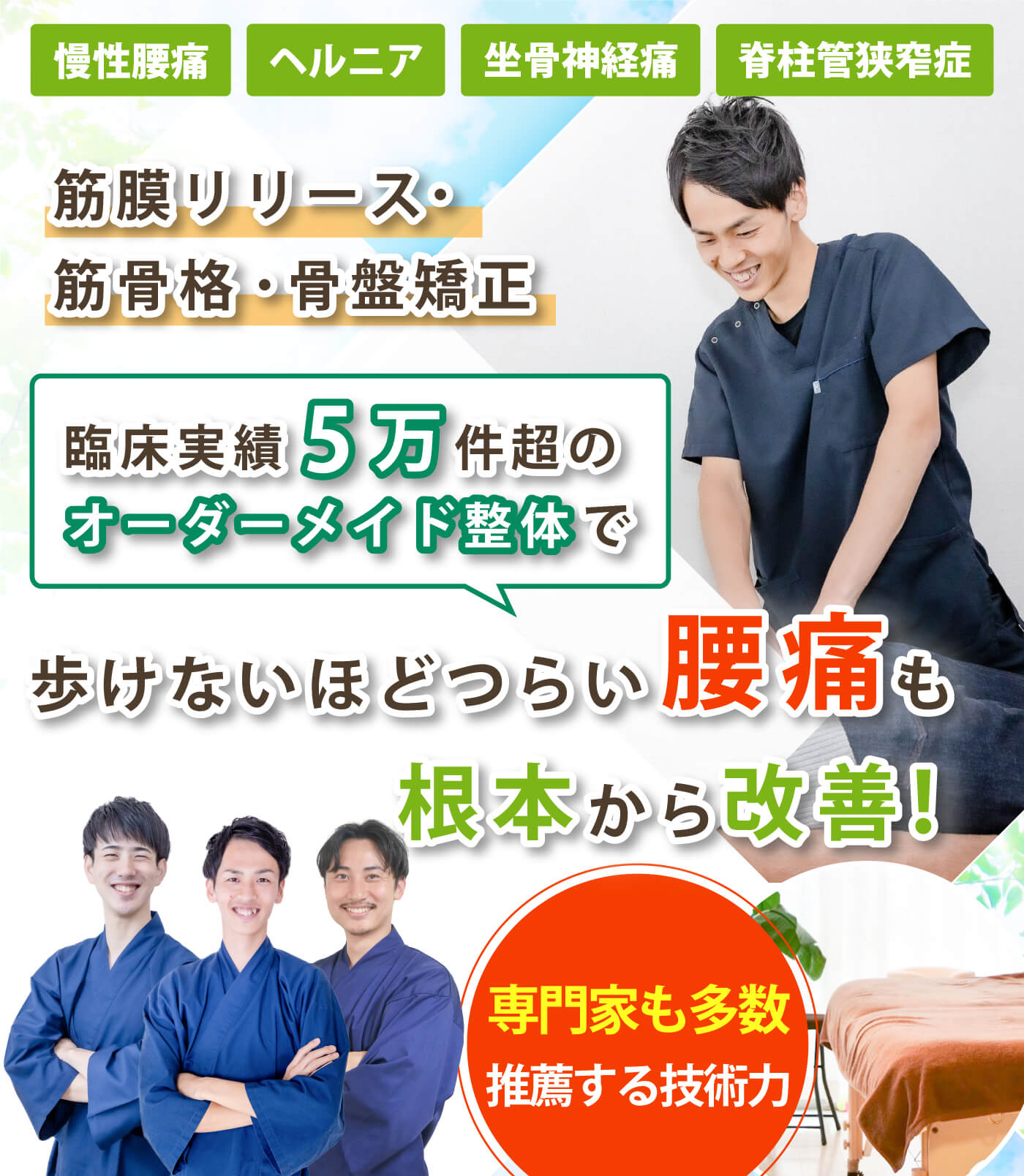 接骨院等でさまざまな施術経験を積んだ院長が立ち上げた整体院で、施術歴10年以上、これまで臨床5万件を超える実績があります。